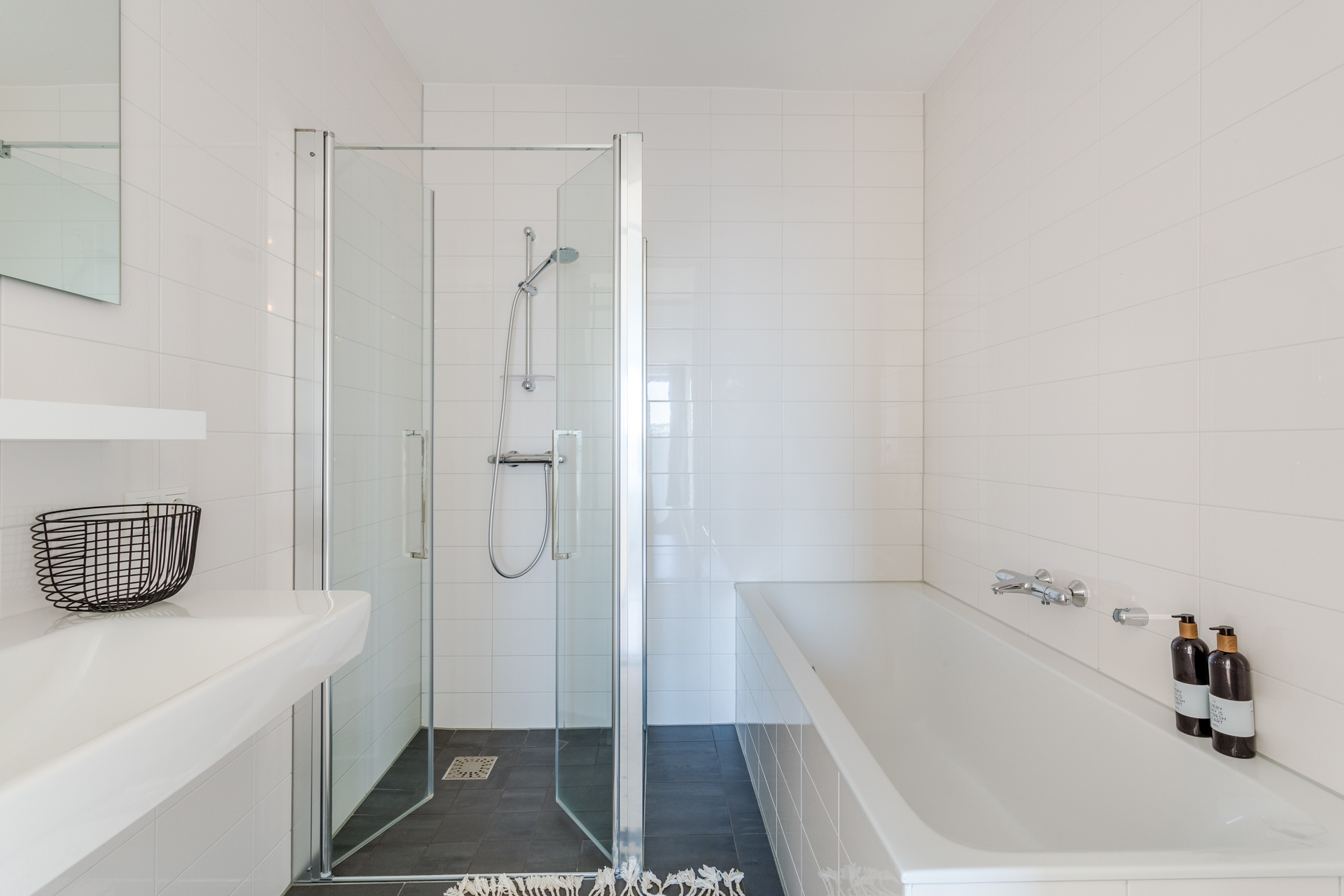 De strak afgewerkte badkamer is voorzien van een ruime douche en wastafel, en het appartement beschikt daarnaast over een separaat toilet. Elk detail in dit appartement is zorgvuldig afgewerkt, waardoor wonen hier luxe, comfort en gemak moeiteloos samenkomen.
